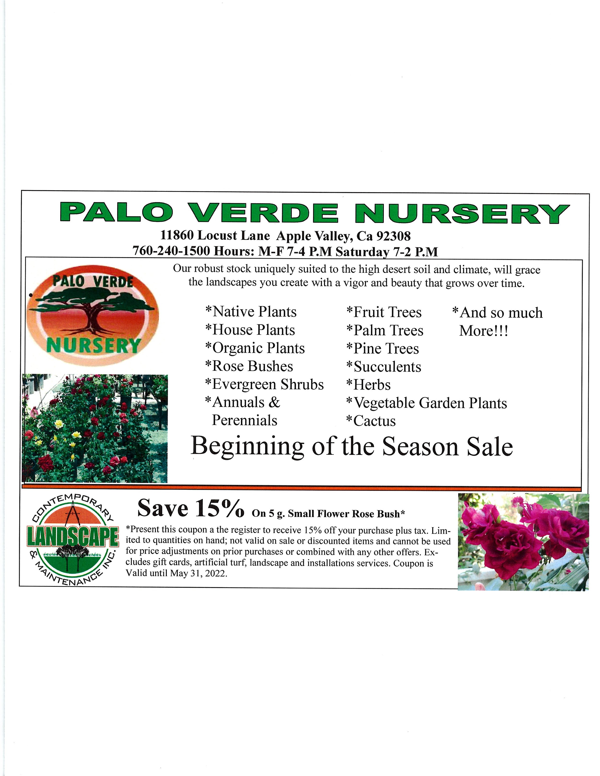 FREE Summer Workshops. Open to the public. Please join us at Palo Verde Nursery for the free summer workshops. 20% off the day of the class only on select items, with printed coupon *Restrictions, apply. For any questions call (760) 240-7770, or email Office@yourclminfo.com